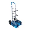 Ce diable en aluminium avec des roues pleines est conçu pour transporter jusqu'à cinq bonbonnes d'eau, facilitant la mobilité et réduisant l'effort dans divers environnements.