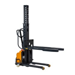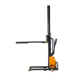 Le déplacement de ce gerbeur se fait manuellement tandis que la montée est électrique grâce à son moteur de 0.8 Kw qui améliorera votre productivité. Doté de fourches de 1150 mm de long avec une hauteur des fourches de 1100mm, ce gerbeur embarqué dispose d’un double mât qui s’élève jusqu’à 2670 mm maximum.