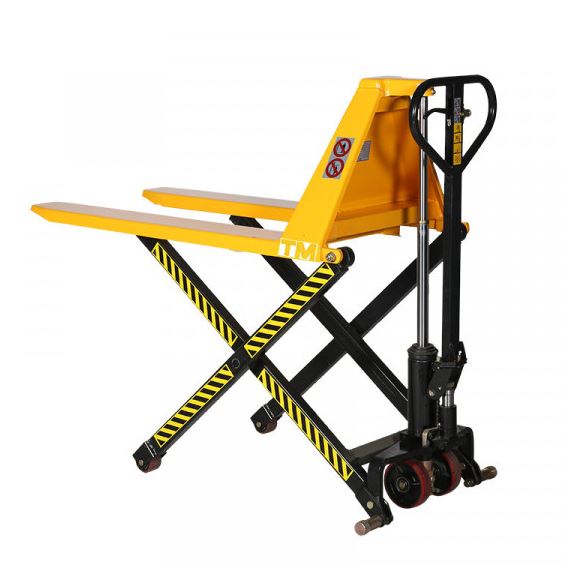 Ce transpalette haute levée possède un écartement extérieur de 680 mm et soulèvera vos charges jusqu'à 800 mm de haut.